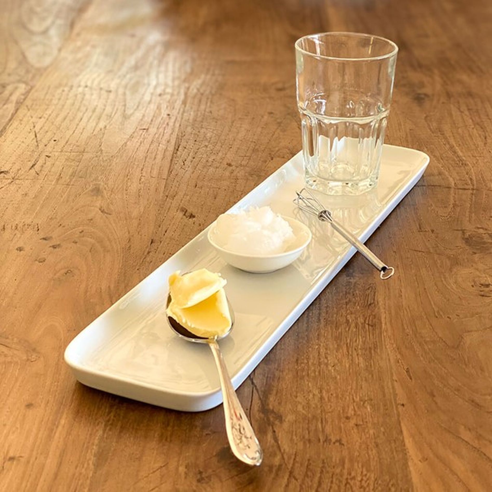 Für meinen Selbstversuch bereite ich mich vor. Weidebutter, Kokosöl, eine grosse Tasse und ein Rührbecher stehen bereit. Ich brühe mir ein starkes Café Crème in den Rührbecher, füge diesem die Butter und das Kokosöl zu.